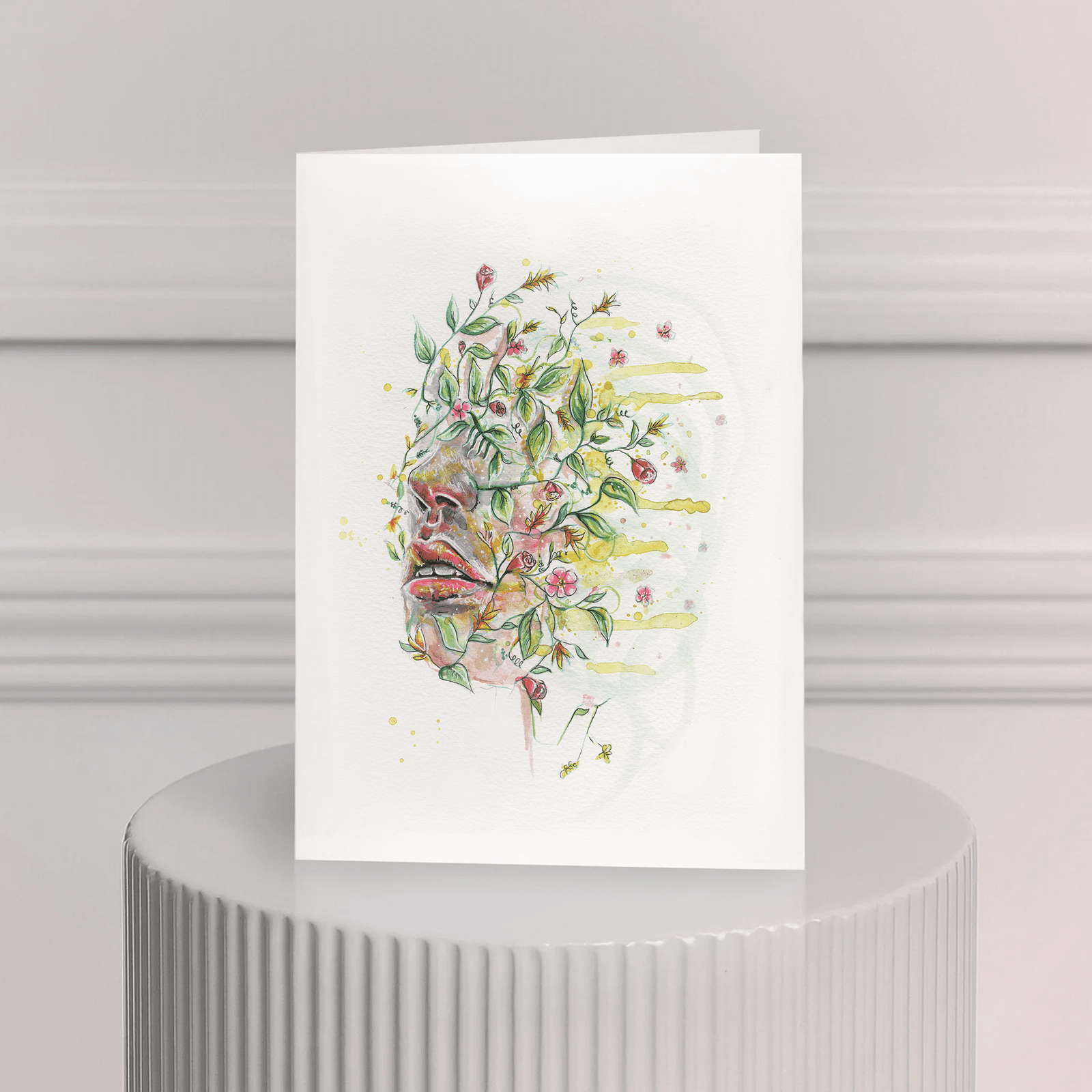 Carte de souhait – ‘Tourmentée’ (Reproduction d’une aquarelle d’un visage et fleurs)
