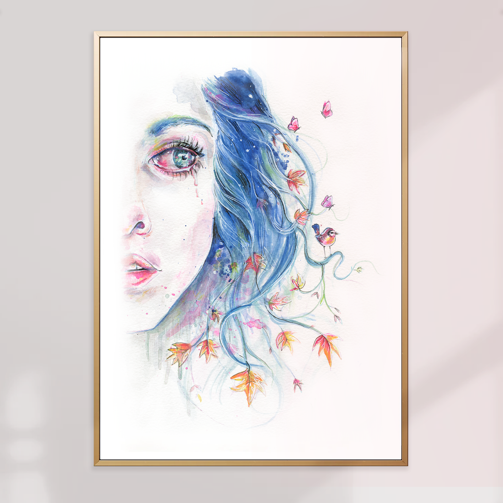 L’affiche artistique nature « Blue dream » est une reproduction d’une aquarelle délicate représentant une femme entourée de feuilles dans des tons bleus apaisants. Cette œuvre poétique illustre l’harmonie entre l’humain et la nature, tout en évoquant la sérénité et le rêve. Grâce à son style raffiné et à sa palette de couleurs douces, elle devient une pièce décorative idéale pour créer une atmosphère calme et inspirante.