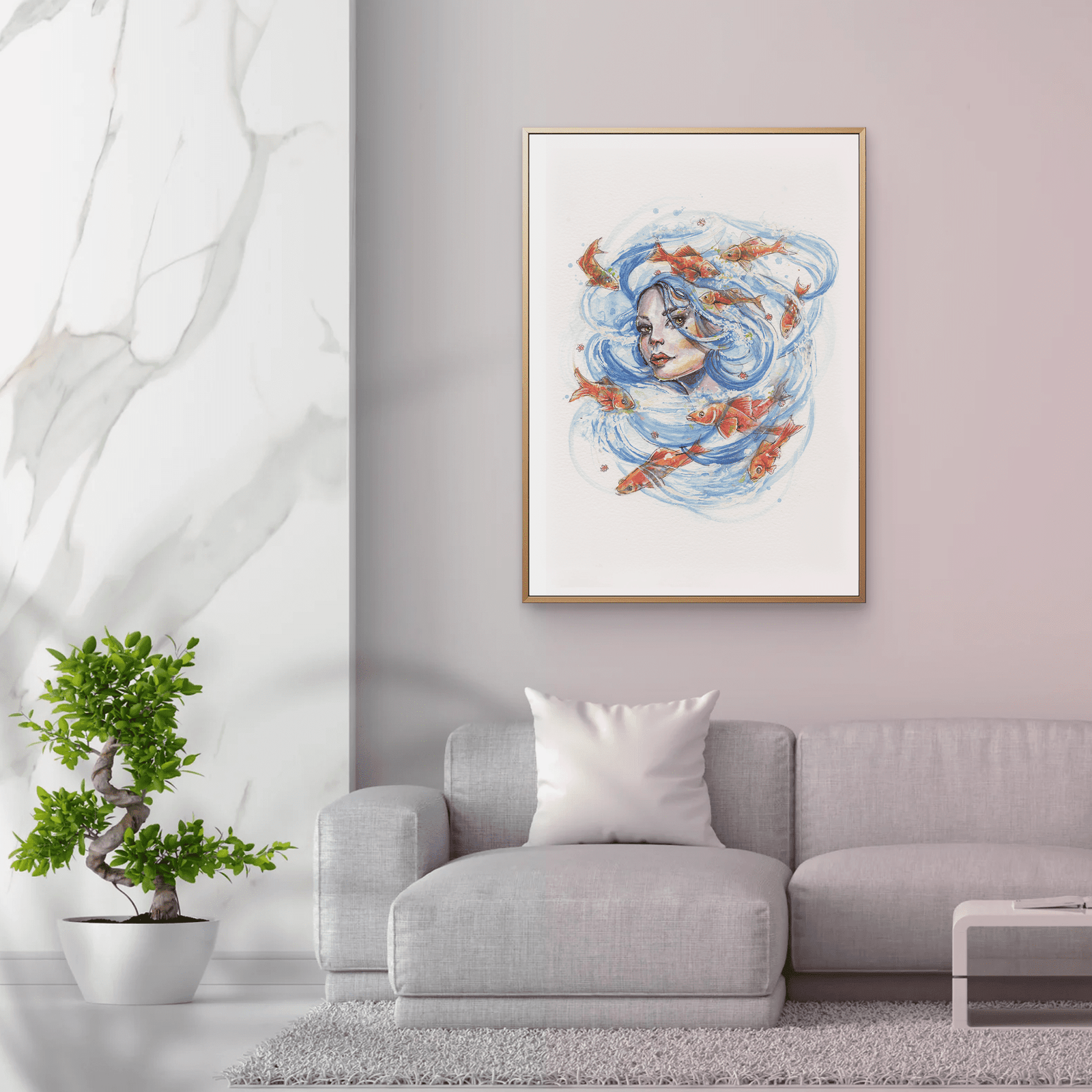 L’œuvre art reproduction « Cheveux d’océan » est une affiche inspirée d’une aquarelle poétique représentant une femme entourée de poissons. Cette création évoque l’harmonie entre l’humain et l’univers marin, mêlant fluidité, imaginaire et sérénité. Les lignes délicates et les tons bleus apaisants renforcent le caractère onirique de cette composition, qui invite à la contemplation et au rêve.