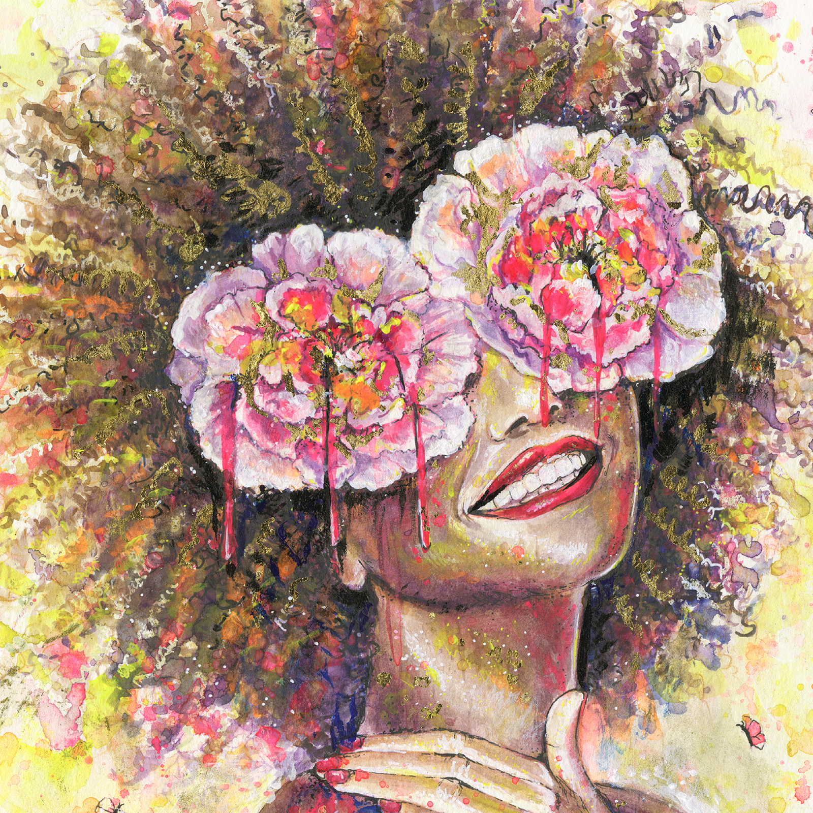 L’affiche pivoine « Énergie vibrante » est une reproduction raffinée d’une aquarelle représentant une femme avec des yeux recouvert de pivoines colorés.