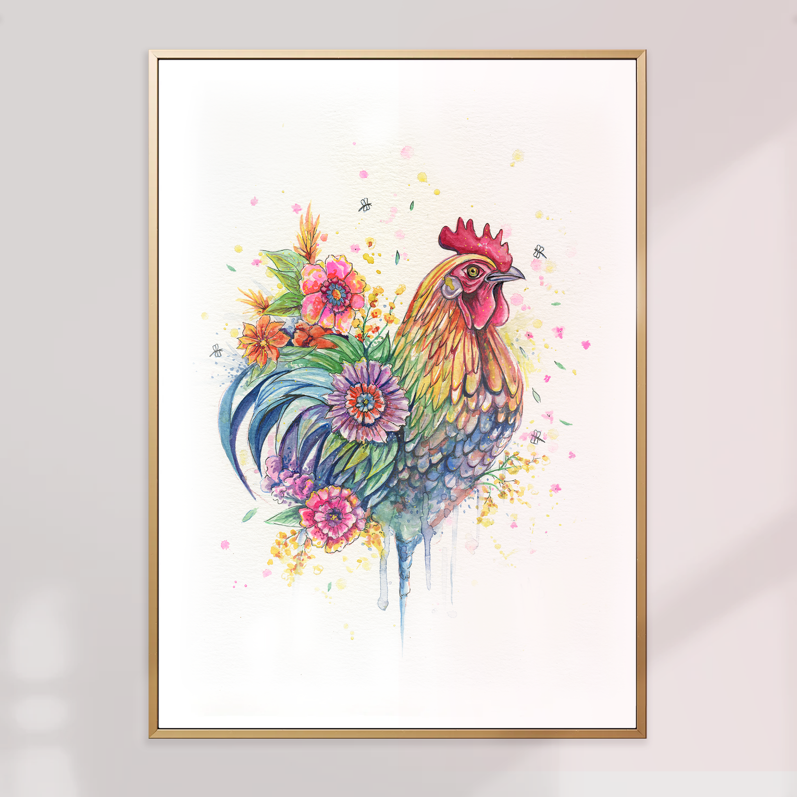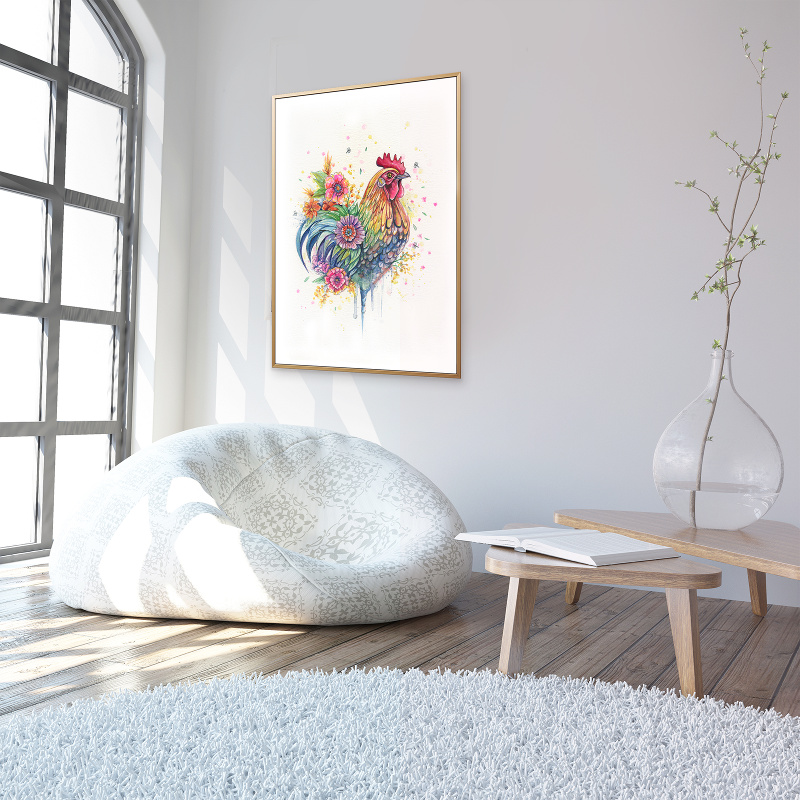 L’affiche coq aquarelle « Le roi de la place » est une reproduction expressive représentant un coq majestueux entouré de fleurs éclatantes. Symbole de fierté et d’énergie, le coq incarne vitalité et puissance. Les fleurs apportent quant à elles une touche de délicatesse et de poésie.
