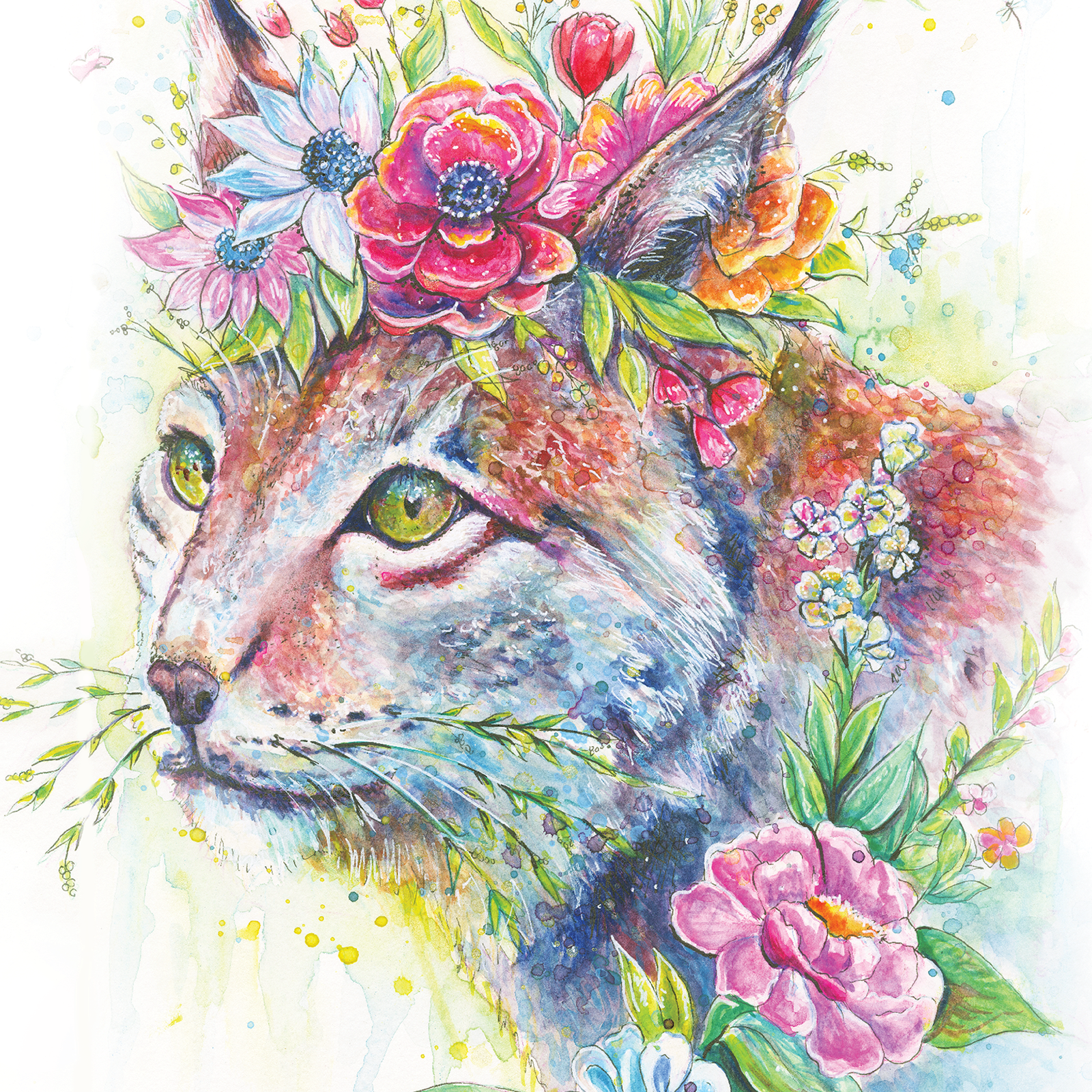 Offrez une carte de souhait en aquarelle unique, illustrant un lynx fleuri délicatement dessiné à la main. Cette œuvre originale mêle finesse et poésie, parfaite pour accompagner vos messages personnels.