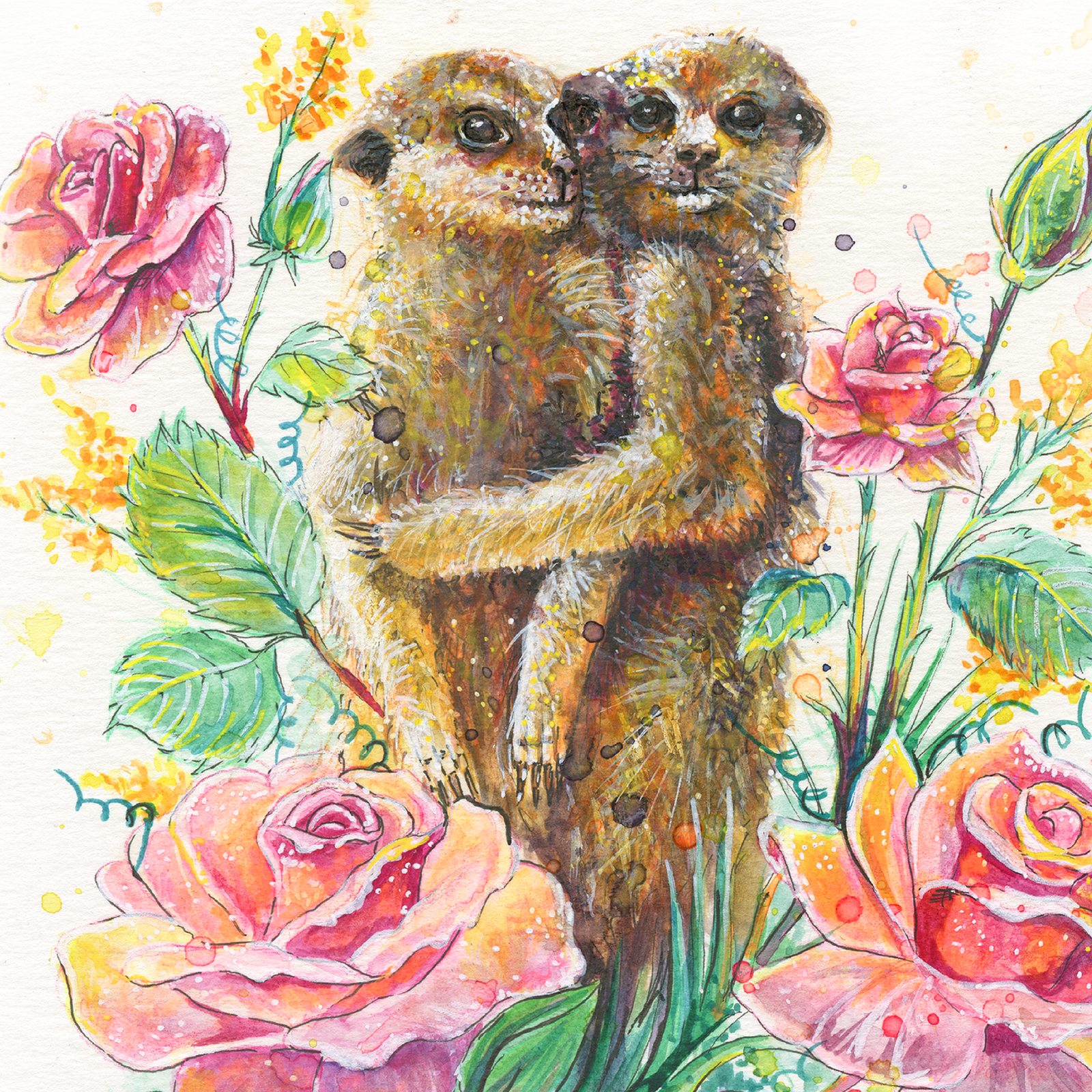 Carte de souhait – ‘Entre frères’ (Reproduction d’une aquarelle de 2 suricates et fleurs)