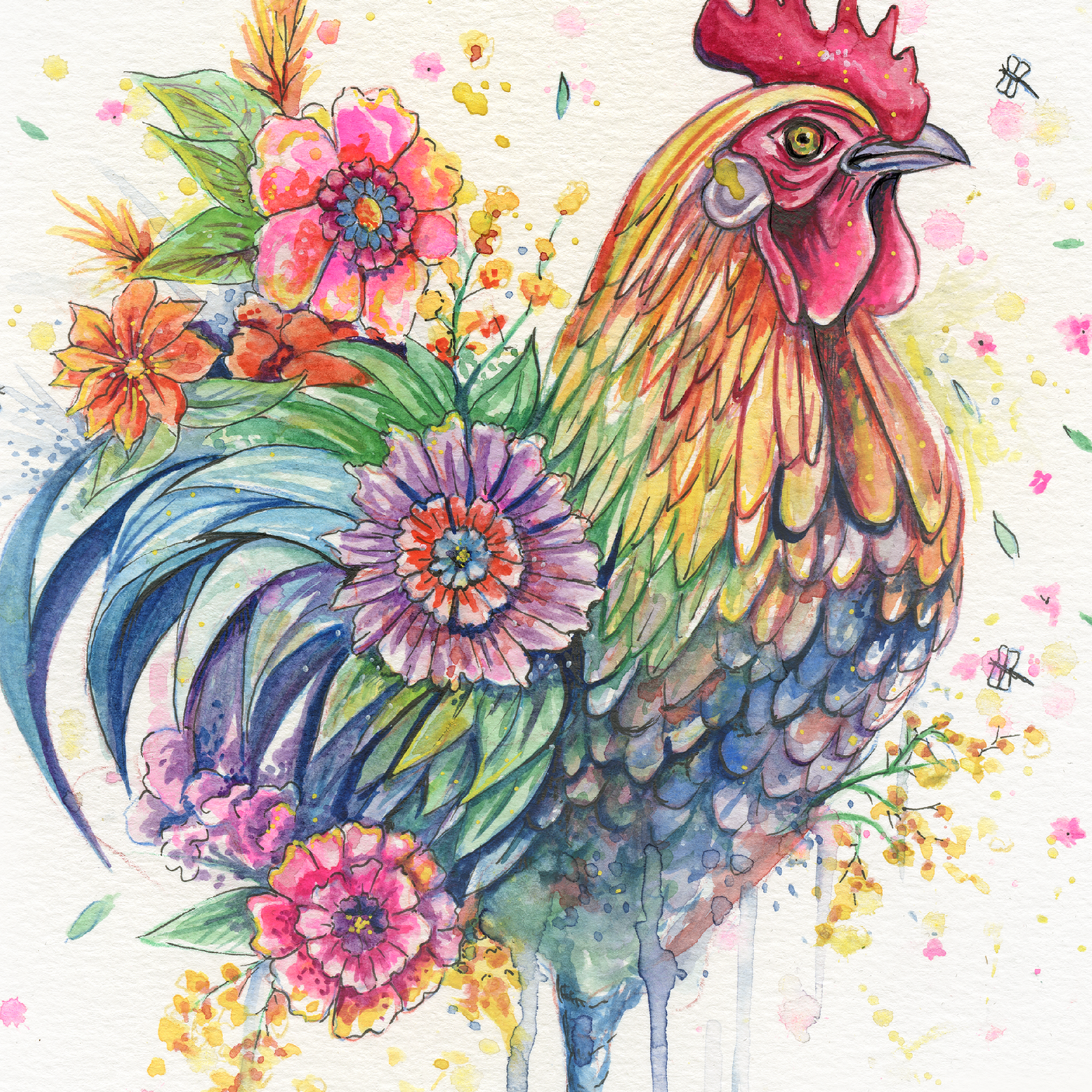 La carte de souhait « Le roi de la place » est une reproduction d’une aquarelle mettant en valeur un coq majestueux entouré de fleurs éclatantes. Cette illustration de coq allie énergie, couleur et symbolisme, en faisant une carte artistique qui attire le regard et inspire la vitalité.